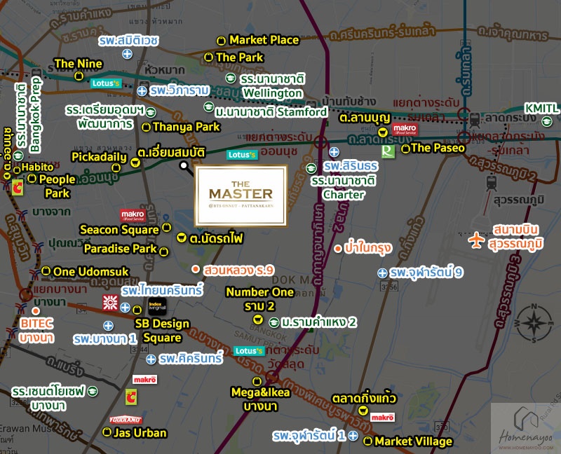 ทำเลที่ตั้งโครงการ โครงการ The Master @BTS อ่อนนุช-พัฒนาการ ตั้งอยู่บนถนนอ่อนนุชที่ใคร ๆ ก็รู้จักกันดี ถือเป็น Prime Location ในการสร้างธุรกิจ เดินทางกันมาได้ไม่ยาก และยังเป็นทำเลที่มีความคึกคัก มี Traffic สูง เพราะมีทั้งห้างสรรพสินค้า โรงเรียน โรงพยาบาล อยู่ใกล้ ๆ มากมาย เช่น Seacon Square, Paradise Park, รร.นานาชาติ Bangkok Prep และ รพ.สมิติเวช ศรีนครินทร์ เรียกว่าเป็นทำเลที่คนพลุกพล่านอยู่แล้ว จึงเหมาะสำหรับการทำธุรกิจเลยค่ะ ที่น่าสนใจอีกเรื่องก็คือ เป็นทำเลที่มีแนวโน้มที่จะมีมูลค่าที่ดินสูงขึ้นอีกมาก เพราะมีรถไฟฟ้าตัดผ่าน 2 สายด้วยกัน ทั้งรถไฟฟ้าสายสีเหลือง และรถไฟฟ้า BTS