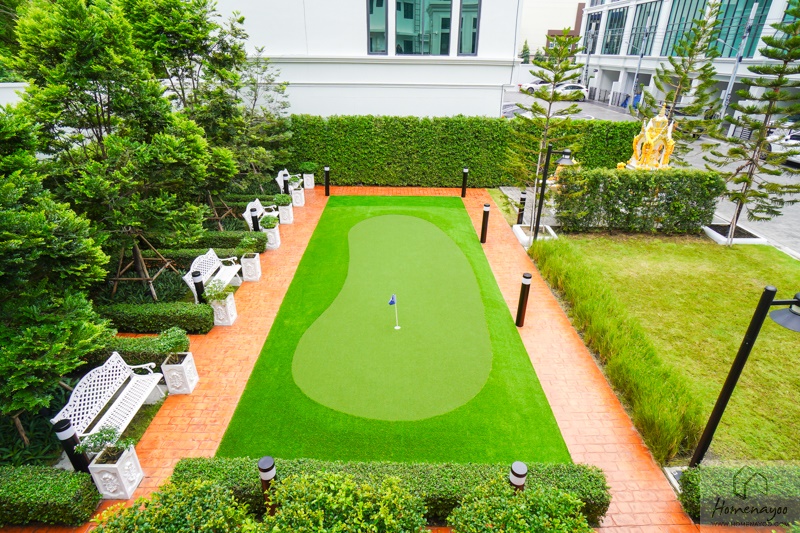 มุมสนามพัตต์กอล์ฟเหมาะสำหรับการพักผ่อนหย่อนใจ ตีกอล์ฟไปแล้วก็ยังใช้คุยธุรกิจได้ด้วยในตัว โดยรอบมีม้านั่งสำหรับนั่งเล่นสบาย ๆ ได้ค่ะ