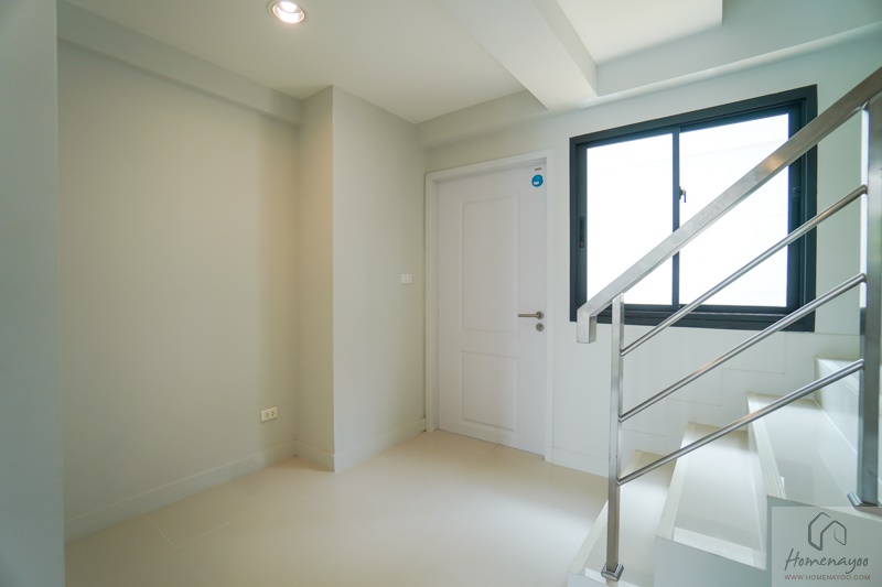 ส่วนบันไดทางขึ้นชั้นบนใช้โครงสร้าง คสล. ปิดผิวด้วยกระเบื้องแกรนิโต ติดราวมือจับสแตนเลส มีความแข็งแรงทนทาน ใต้บันไดจะมีตู้เก็บของให้ด้วย ใช้ Manage จัดเก็บสิ่งของภายในอาคารให้เรียบร้อยได้