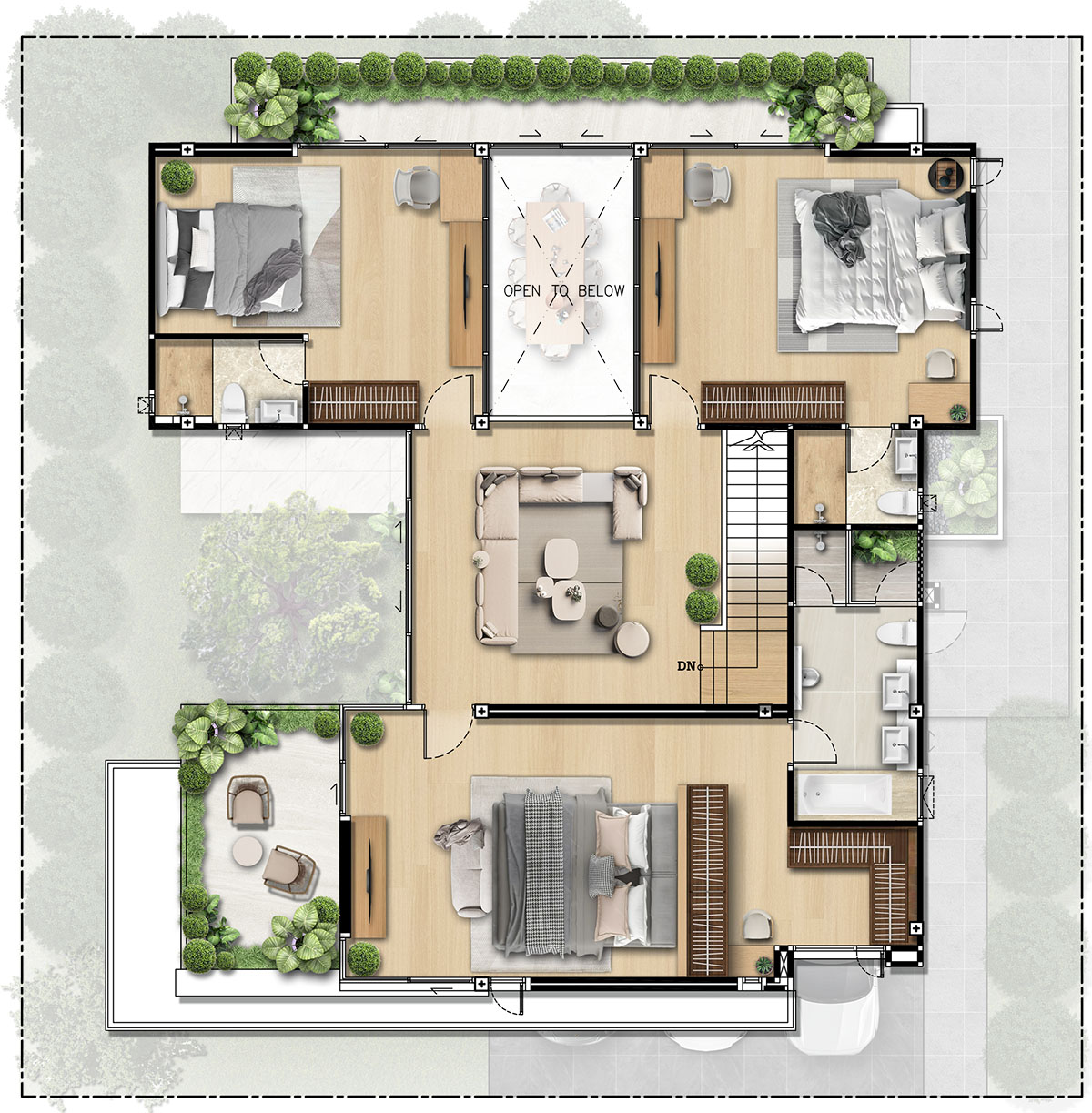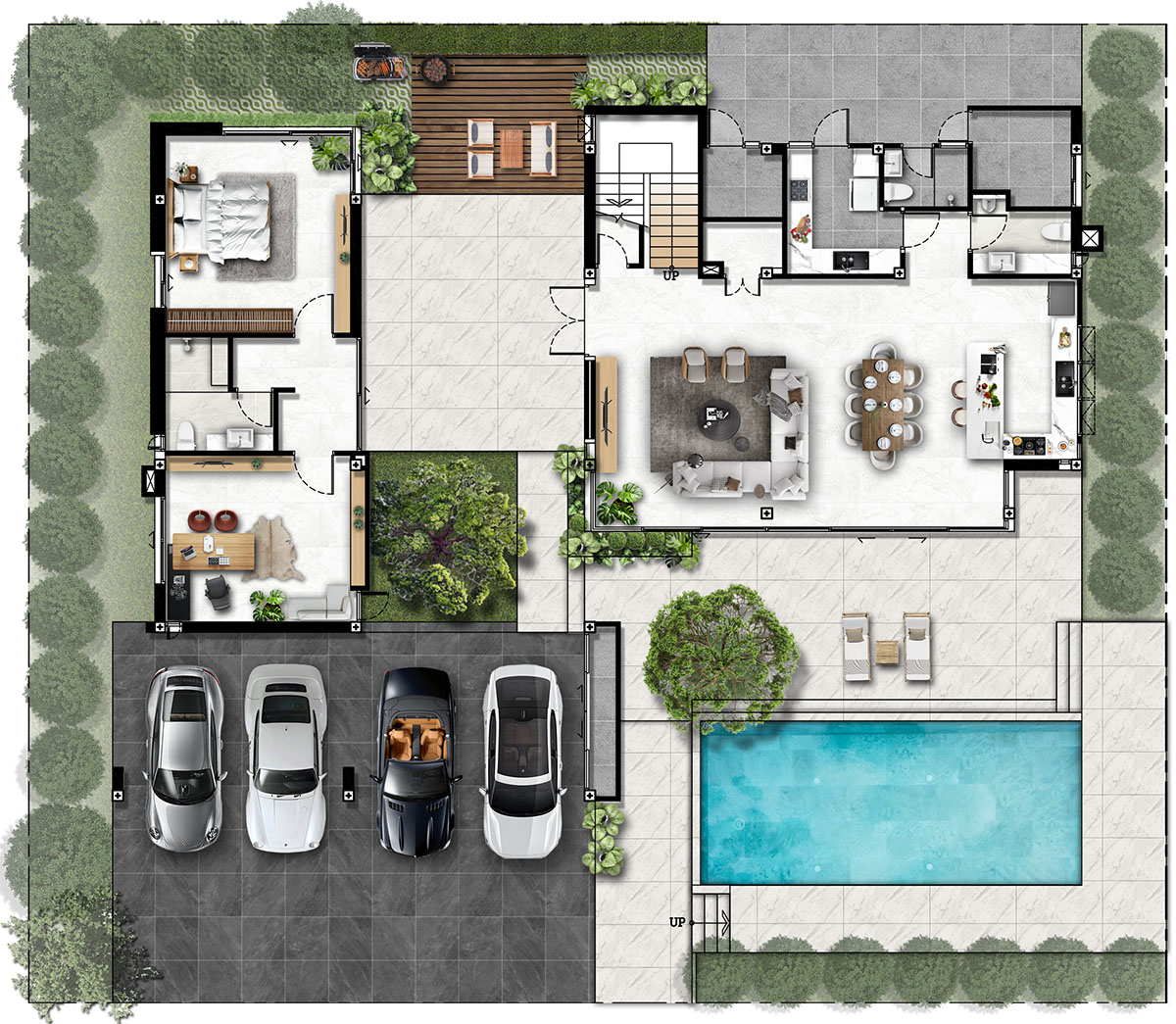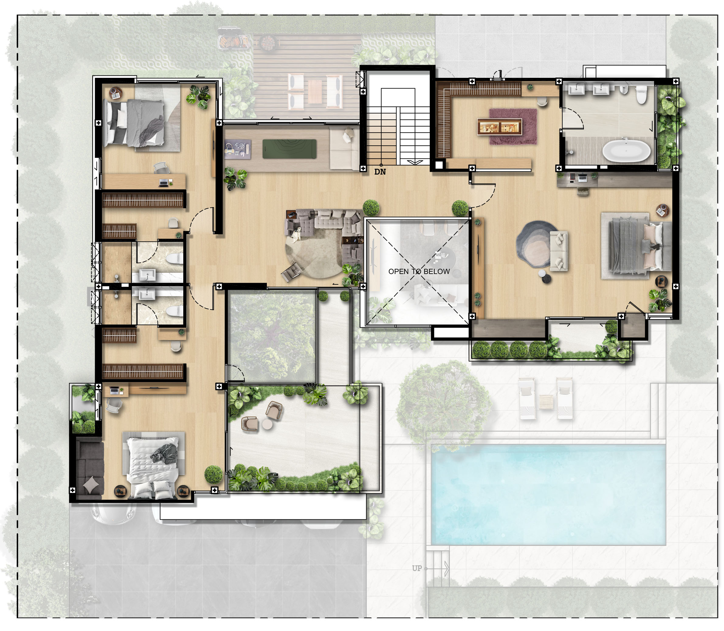 • ฟังก์ชันบ้าน 4 ห้องนอน 5 ห้องน้ำ 4 ที่จอดรถ