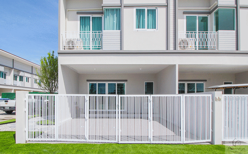 ประตูรั้วเหล็กทาสีขาวเข้ากับสีของตัวบ้าน จะเป็นแบบพับ 6 ตอน บ้านหน้ากว้าง 5.7 ม.