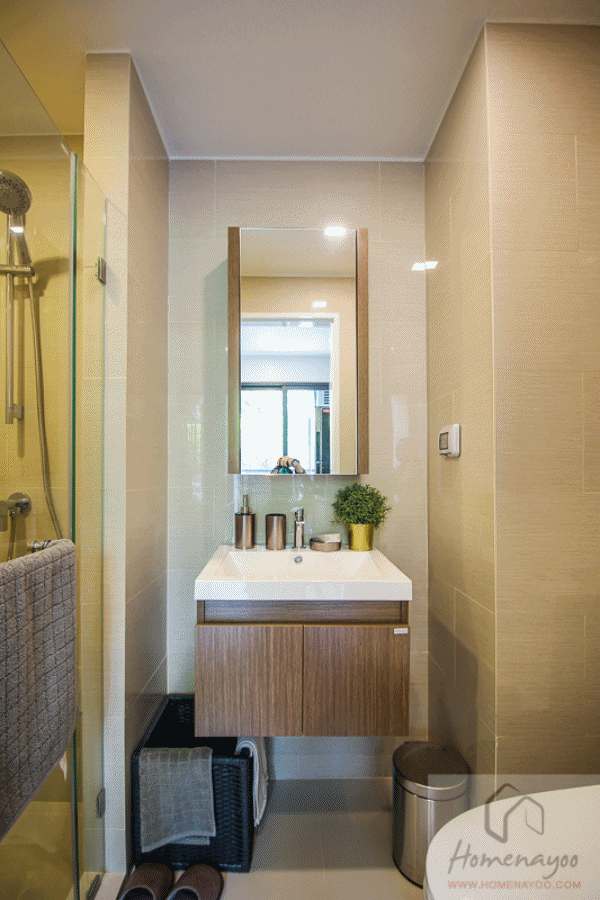 ภายในห้องน้ำมีพื้นที่ส่วนเปียกส่วนแห้ง ได้ชุดอ่างล้างหน้าเป็นตู้กระจกบานเปิด ด้านล่างมีตู้ไว้ให้เก็บของได้อีก