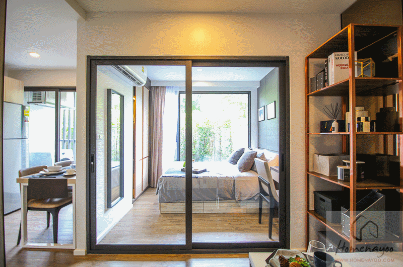 เดินเข้าห้องมาจะเจอส่วนห้องนั่งเล่นก่อน ด้านในจะเป็นห้องนอน มีฉากกั้นบานเลื่อนแยกส่วน ซ้ายมือเป็นทางเดินเข้าห้องครัว ห้องน้ำ และระเบียง พื้นห้องเป็นกระเบื้องไวนิลลายไม้ คุณสมบัติทนรอยขีดข่วน ทนน้ำได้ดี ฝ้าสูง 2.5 ม. ผนังได้ฉาบเรียบทาสีทั้งห้อง