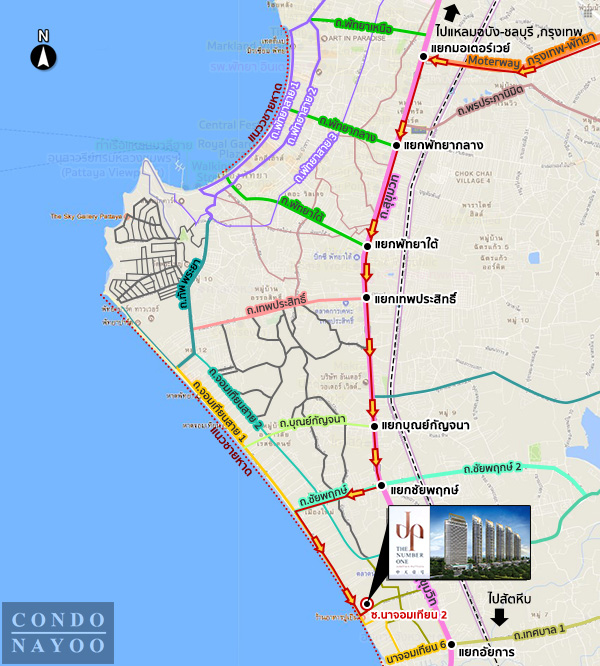 การเดินทางเริ่มจาก มอเตอร์เวย์ กรุงเทพ-พัทยา แยกมอเตอร์เวย์ ⇒ ถ.สุขุมวิท (ทล.3) ⇒ แยกชัยพฤกษ์ ⇒ ถ.ชัยพฤกษ์ ⇒ ถ.จอมเทียนสาย 1 ⇒ ซ.นาจอมเทียน 2 ถึงโครงการ The Number One Jomtien Pattaya *ตรงข้ามเยื้องๆ ร้านอาหารปูเป็น