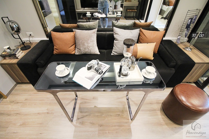 ทางโครงการจัดห้องตัวอย่างให้เป็นห้องนั่งเล่นขนาดใหญ่ สามารถวางโซฟาขนาด 3 ที่นั่งได้แบบนี้ค่ะ เราสามารถวางโต๊ะรับประทานอาหารขนาดเล็กๆ แบบยาวเรียวแทนตำแหน่งของโต๊ะกาแฟ และใช้โซฟาเป็นเก้าอี้นั่งสำหรับรับประทานอาหารไปในตัวตามแบบห้องตัวอย่างได้เลย หรือจะวางโซฟา Love Seat ขนาด 2 ที่นั่ง แล้ววางโต๊ะรับประทานอาหารและเก้าอี้เอาไว้ด้านข้างโซฟาก็ได้เช่นกัน