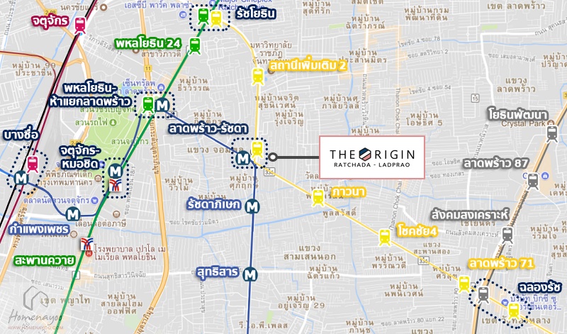 แผนที่จากทางโครงการ The Origin รัชดา – ลาดพร้าว ในซอยลาดพร้าว 23 บนจุดศูนย์กลางการเชื่อมต่อระบบราง ห่างจาก รถไฟฟ้า MRT สถานีลาดพร้าว เพียง 450 เมตร และห่างจาก รถไฟฟ้า MRT สายสีเหลือง สถานีรัชดาภิเษก เพียง 25 เมตร เข้า – ออกได้ทั้งจากถนนลาดพร้าว และ ถนนรัชดาภิเษก ใกล้ ทางพิเศษฉลองรัช และ ทางยกระดับดอนเมืองโทลล์เวย์ อยู่บนจุดศูนย์กลางของสิ่งอำนวยความสะดวกต่างๆ ไม่ว่าจะเป็นห้างสรรพสินค้า, โรงพยาบาล, โรงเรียนชื่อดัง และแหล่งงาน