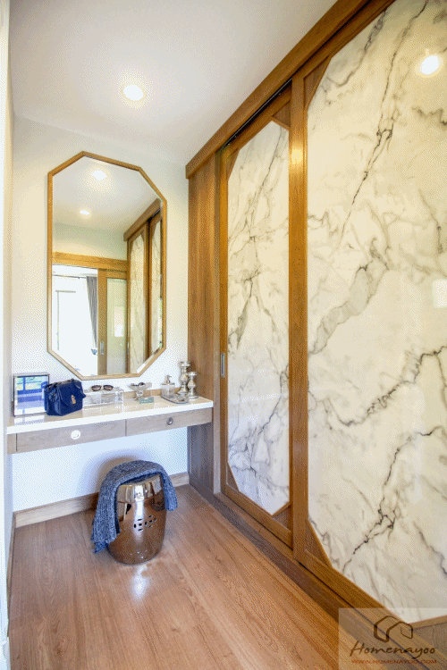 ภายในส่วน Walk in Closet สามารถวางหรือ Built-in ตู้เสื้อผ้าขนาดใหญ่ได้ 2 ตู้พร้อมโต๊ะเครื่องแป้ง 1 ตัวตรงกลาง
