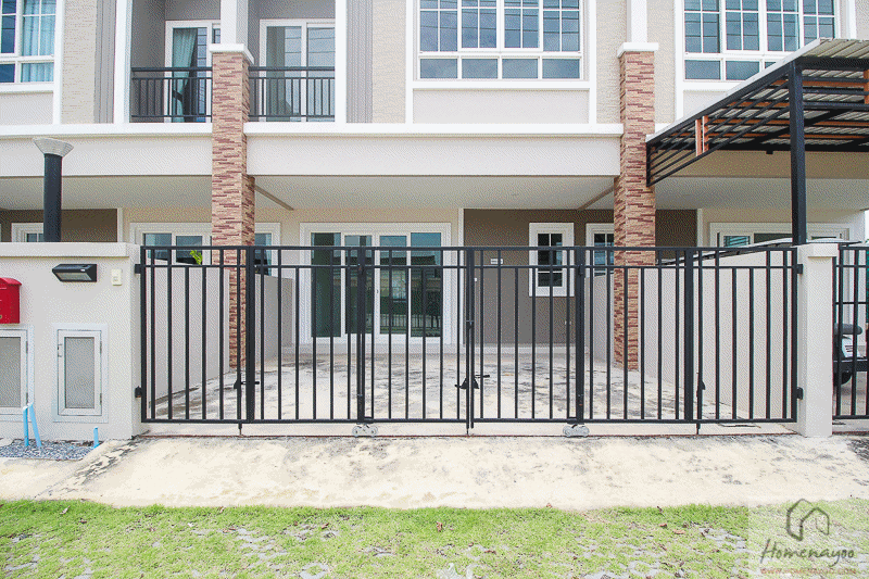 สำหรับในบ้านมาตรฐานจะได้ประตูรั้วหน้าบ้านเป็นบานพับเหล็กทาสีดำ เปิดได้เต็มหน้ากว้าง