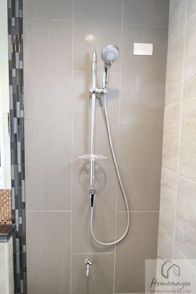 ฝักบัวและที่วางของ ข้างกันนั้นเป็นหน้าต่างกระจกบานกระทุ้งบานเล็กทำให้มีแสงเข้ามาได้ และช่วยถ่ายเทอากาศ