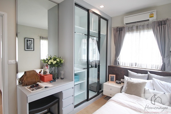 ข้างเตียงมีพื้นที่ให้วางตู้เสื้อผ้าใบใหญ่ซึ่งประตูตู้ควรเป็นแบบบานเลื่อนเพื่อให้ใช้งานได้สะดวก ติดกั้นนั้นเป็นโต๊ะเครื่องแป้ง