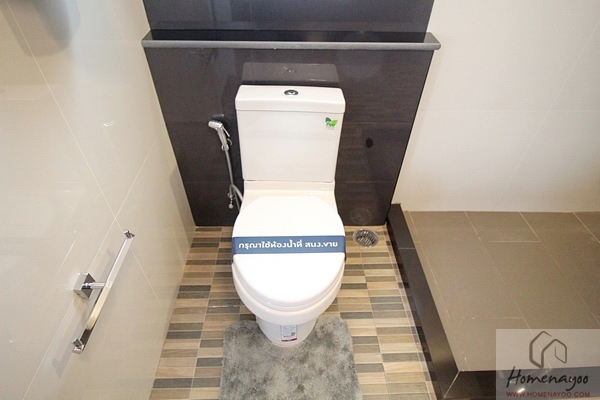 พื้นห้องน้ำลดระดับจากพื้นห้องลงไปเล็กน้อย พื้นปูด้วยกระเบื้องลายหินอ่อนขนาด 30×30 ซม. ประตูมี 2 บานซึ่งจะเชื่อมจากโถงทางเดินและจากในห้อง Master Bedroom ค่ะ