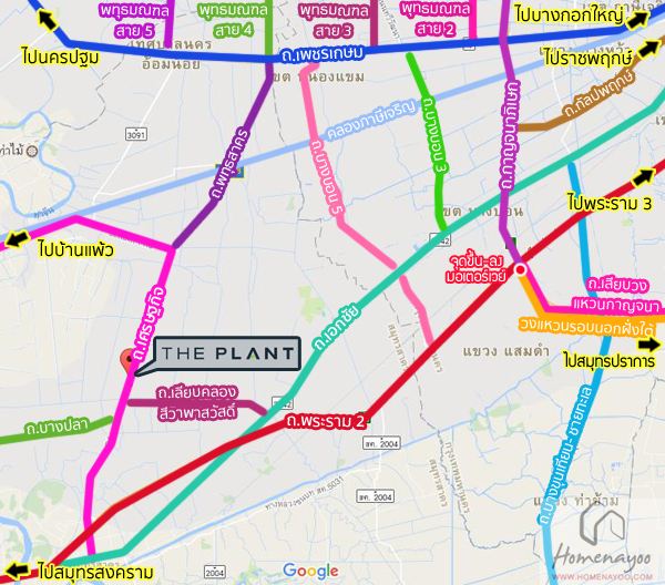 เรามีภาพการเดินทางโดยรถมาให้ชมกัน เส้นทางการเดินทางตามลูกศรแดง โดยเริ่มเดินทางจาก จากถนนเอกชัย → เลี้ยวขวาเข้าถนนเลียบคลองสีวาพาสวัสดิ์ → เลี้ยวซ้ายเข้าถนนเศรษฐกิจ 1 →ตรงไปประมาณ 650 ม. แล้วกลับรถ →ตรงไปประมาณ 2.6 กม. แล้วกลับรถอีกครั้ง → ตรงเข้าไปประมาณ 1.4 กม. ก็จะเจอพื้นที่โครงการ The Plant ถ.เศรษฐกิจ (พระราม 2 – พุทธสาคร) แล้วค่ะ