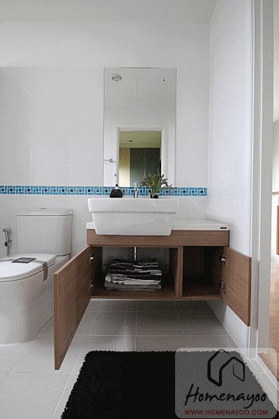 อ่างล้างมือพร้อมกระจกเงาและใต้อ่างมีชั้นเก็บของมาให้ ของจริงได้ตามนี้ ด้านข้างอ่างมีพื้นที่มาให้ใช้วางของเพิ่มได้ โถสุขภัณฑ์และอุปกรณ์เป็นแบบเดียวกันกับห้องน้ำห้องอื่นๆในบ้าน
