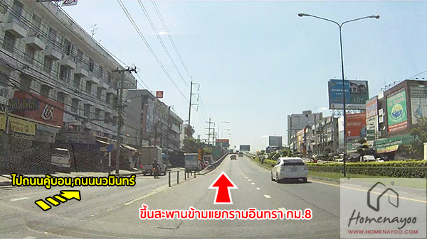 การเดินทางเราเริ่มจากถนนรามอินทรา มุ่งหน้าไปถนนกาญจนาภิเษก-มีนบุรี ชิดขวาขึ้นสะพานข้ามแยกรามอินทรา กม.8