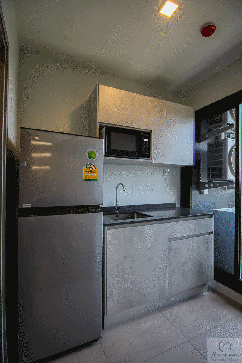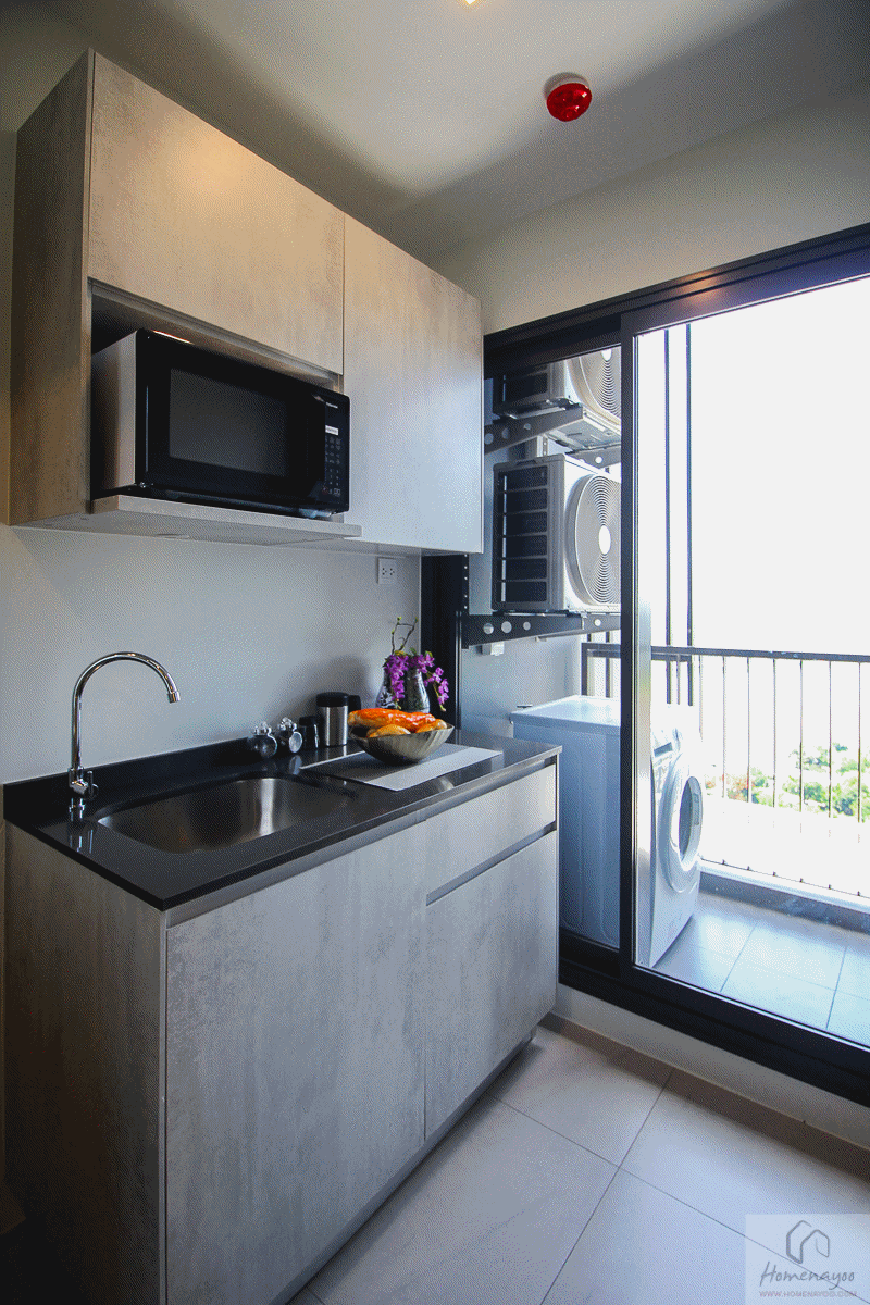 ถัดมาเป็นห้องครัว ได้เป็นครัวปิดมีฉากกั้นบานเลื่อนเปิดปิดแยกส่วนได้ ในครัวพื้นจะปูกระเบื้องมาให้ ได้ชุดเคาน์เตอร์ครัวตามนี้เลย ได้อ่างล้างจานแบบหลุมเดียว ฝังท็อปเคาน์เตอร์มาให้ ด้านข้างมีพื้นที่ให้วางเตาไฟฟ้าได้อีก ถัดไปเป็นระเบียงมีประตูกระจกบานเลื่อน 2 บาน ขวามือมีพื้นที่ไว้ให้วางตู้เย็นได้