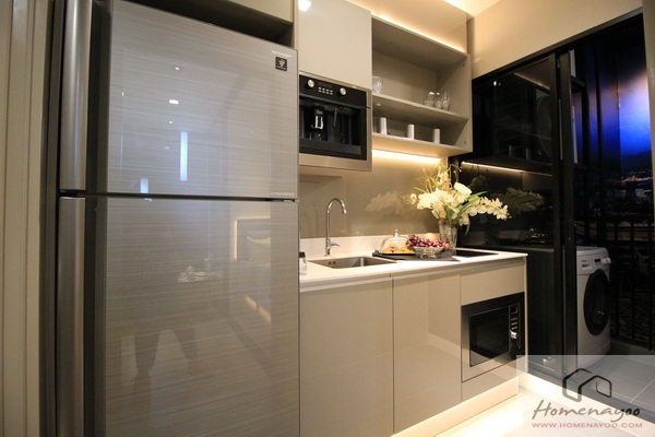 ห้องครัวติดตั้งเคาน์เตอร์ครัวให้ครบชุด มีระเบียงแยกส่วนชัดเจนไว้ด้านนอก