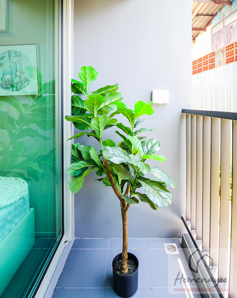 ที่ผนังมีเต้าเสียบปลั๊กไฟพร้อมฝาครอบกันน้ำ และมีท่อระบายน้ำที่พื้นระเบียงมาให้เรียบร้อย