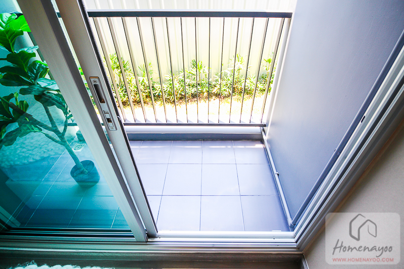 จากห้องนั่งเล่นจะมีประตูแบบบานเลื่อนกระจกเปิดออกไประเบียง ช่วยรับแสงธรรมชาติเข้ามาในตัวห้องได้ดี แถมวันไหนลมดีๆก็เปิดรับลมธรรมชาติเข้าสู่ห้องนั่งเล่นได้เต็มที่ ประตูบานเลื่อนเป็นอลูมิเนียมสีธรรมชาติ ลูกฟักกระจกเขียวตัดแสงช่วยกันความร้อนได้ดีกว่ากระจกใสทั่วๆไป เป็นบานเลื่อนแบบ 3 ตอน ข้อดีคือเปิดรับลมได้กว้างกว่าแบบ 2 ตอน มือจับประตูเซาะร่องมาตรฐาน
