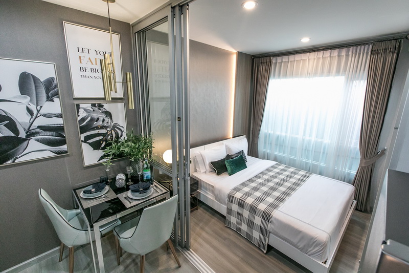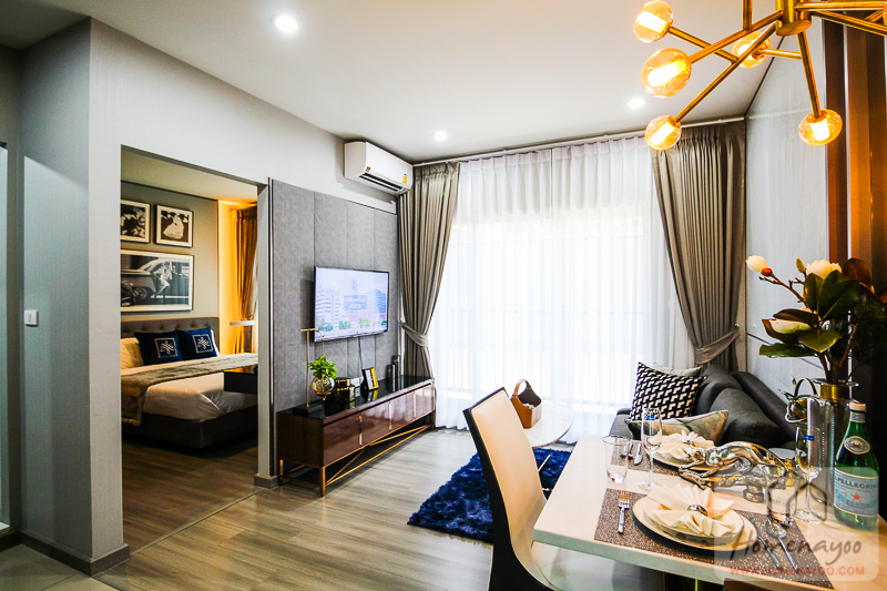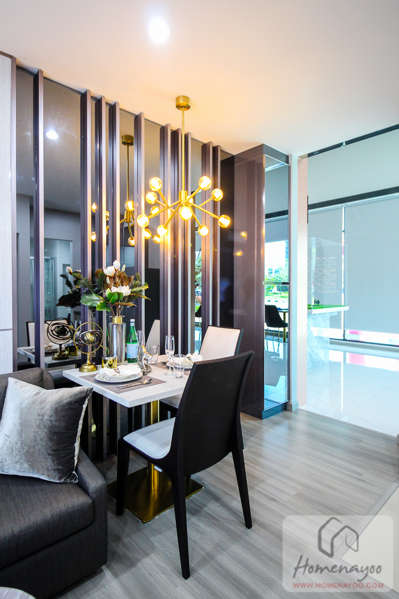 ลักษณะห้องเมื่อเข้ามาจะเจอ กับ Pantry ครัว และ โต๊ะทานข้าวนั่งได้ 2 ที่นั่ง อยู่ฝั่งตรงข้าม โดยจะเชื่อมต่อกับพื้นที่ห้องรับแขก ส่วนห้องนอนจะมีประตูบานเลื่อนกระจกกั้นทำให้ห้องเป็นสัดส่วน ให้ความรู้สึกเหมือน 1 ห้องนอน ในห้องมีบานหน้าต่าง สามารถนอนชมวิวได้