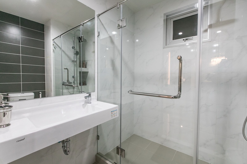 ส่วนอาบน้ำมีฉากกั้นห้องมาให้เป็นกระจกเทมเปอร์ กรอบอลูมิเนียม ลูกฟักกระจกใสแบบบานเลื่อน 3 ตอน วางบนธรณีก่อสูงขึ้นมาประมาณ 5 ซม. เพื่อกั้นระหว่างพื้นส่วนเปียกส่วนแห้ง