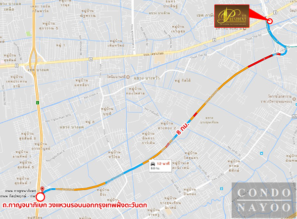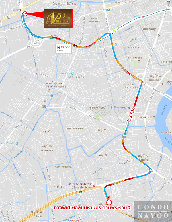 การเดินทางเริ่มทางแยกต่างระดับสวนเลียบ ถนนราชพฤกษ์ มาจากสาทร (BTS วุฒากาศ) ⇒ ทางแยกต่างระดับเพชรเกษม (BTS บางหว้า เชื่อมกับ MRT บางหว้า) ⇒ ถนนเพชรเกษม ตรงไปกลับรถ ⇒ อีก 600 เมตร กลับรถที่ปั๊มคาลเท็กซ์ อีกประมาณ 160 เมตรถึงโครงการ The President สาทร–ราชพฤกษ์ 1