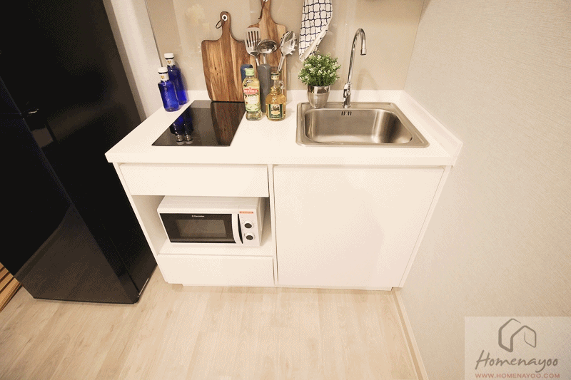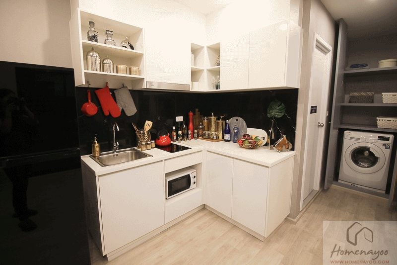 ฝั่งซ้ายมือทางโครงการให้เคาน์เตอร์ครัวแบบ L Shape พร้อมเตาปรุงอาหาร, อ่างล้างจาน และเครื่องดูดควัน แต่ไม่ได้แถมตู้เย็นและเตาไมโครเวฟมาด้วยนะ