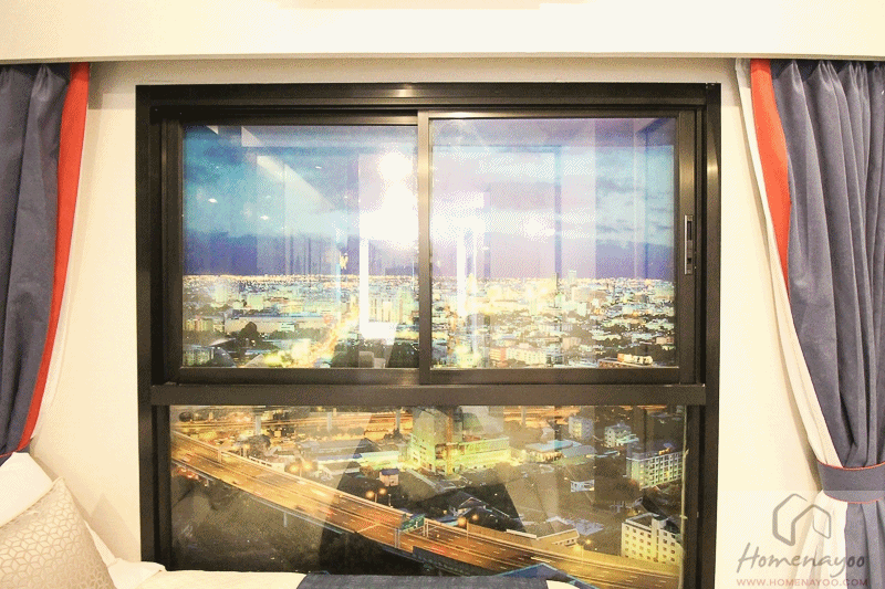 หน้าต่างของห้องเป็นบานเลื่อนอลูมิเนียมสีดำติดกระจกเขียวตัดแสง ส่วนบานล่างจะเป็นบาน Fix นะ