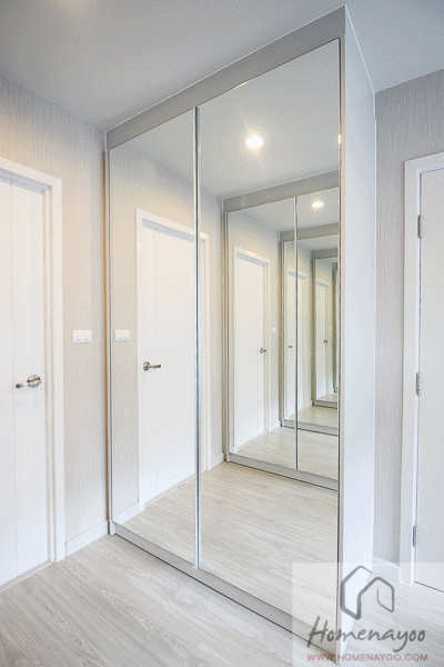 ตู้เสื้อผ้าจะเป็นแบบ Walk-in Closet โดยจะมีประตูบานเลื่อนกระจกฝ้ากั้นออกจากห้องนอนอย่างเป็นสัดส่วนโดยสามารถเลื่อนเปิดได้หลายรูปแบบค่ะ