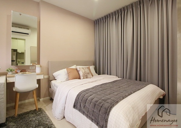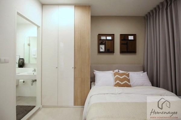 ห้องนอนขนาดพอเหมาะ โครงการให้ฐานเตียงนอน ขนาด 5 ฟุต ไม่รวมที่นอน พร้อมเฟอร์นิเจอร์มาตรฐานแบบในภาพ หากใครที่ไม่เน้นการใช้งานรอบเตียงมากนัก จะเปลี่ยนเตียงนอน เป็นขนาด 6 ฟุต ก็สามารถทำได้ค่ะ