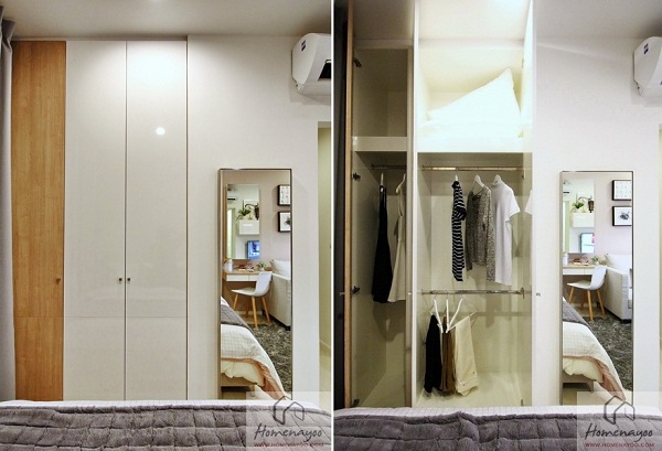 ผนังส่วนโต๊ะเครื่องแป้ง ติดตั้งตู้เก็บของหน้าบานกระจกเงาไว้ให้แบบในภาพ เปิดออกมาด้านในแบ่งชั้นลอยไว้ 4 ชั้น เก็บของได้อย่างเป็นระเบียบ