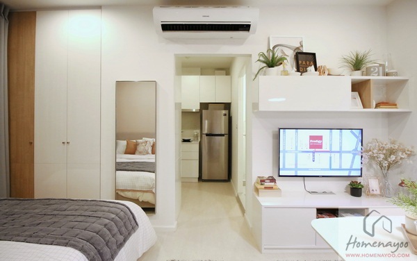 เปิดประตูห้องพักเข้ามา ส่วนแรกเป็นพื้นที่พักผ่อนขนาดใหญ่ ถัดเข้าไปแบ่งเป็น 2 ส่วน คือห้องนอน พร้อมห้องน้ำในตัว และห้องครัวแบบปิด พร้อมระเบียงซักล้างด้านนอก ความสูงพื้น-เพดาน 2.6 เมตร เท่ากันทุกยูนิต ในส่วนของวัสดุและอุปกรณ์ภายในห้องพักมาตรฐานเดียวกันทั้งโครงการค่ะ