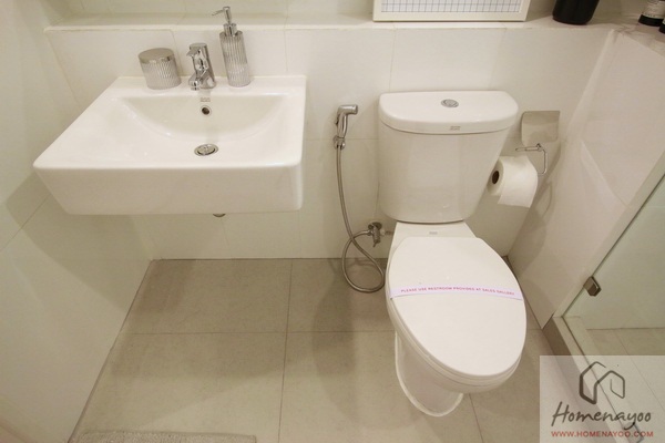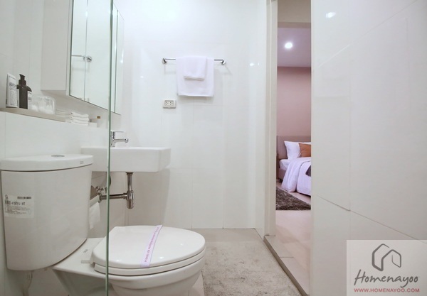 ส่วนอาบน้ำจะอยู่ด้านในสุด ก่อธรณีสูง 10 ซม. ป้องกันน้ำออก ห้องจริงไม่มีฉากกั้นอาบน้ำให้ สามารถซื้อมาติดเพิ่มเติมเองได้ ส่วนด้านในติดตั้งฝักบัว Hand Shower สายอ่อน ก๊อกน้ำก้านโยก ผนังติดตั้งที่วางสบู่ พร้อมเดินงานระบบ รองรับการติดตั้งเครื่องทำให้อุ่นให้เรียบร้อย