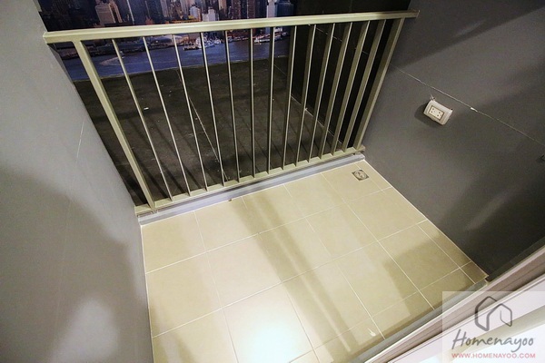ระเบียงด้านนอก ปูพื้นกระเบื้องเซรามิคกันลื่นสีเทา 30×30 ซม. พื้นที่ใช้งานขนาด 2.20 x 1.0 เมตร กว้างพอสมควร สามารถวางราวตากผ้าขนดกลาง หรือจะวางชุดโต๊ะเก้าอี้สนามก็ได้นะ ซ้ายมือเป็นพื้นที่สำหรับวางเครื่องซักผ้า ทางโครงการเดินงานระบบประปา+ไฟฟ้าให้พร้อม เหนือขึ้นไปแขวนคอมฯแอร์ 2 เครื่อง ส่วนราวกันตก เป็นโครงเหล็กสีเทา ความสูงประมาณ 1 เมตร