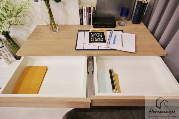 ขนาดของโต๊ะทำงานออกแบบมาได้อย่างลงตัว หน้าโต๊ะกว้างกำลังดี วางโน๊ตบุ๊ค, ทำงานเอกสาร หรือไว้ให้เด็กๆ นั่งทำการบ้านได้สะดวกเลยค่ะ ใต้โต๊ะมีลิ้นชักเก็บของมาให้อีก 2 ช่อง เปิดดูด้านในเก็บของจุกจิกได้เยอะพอสมควรนะ