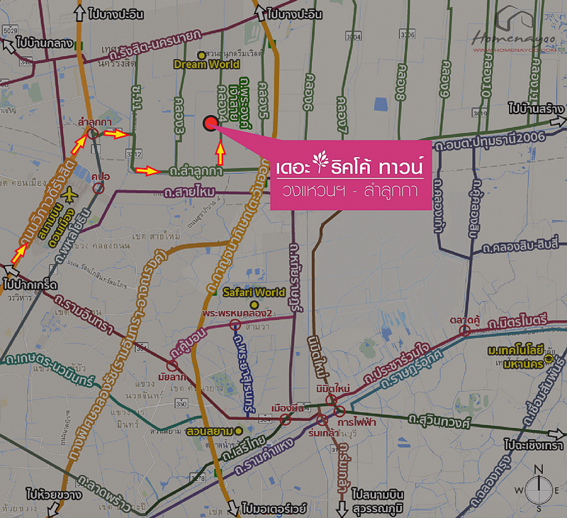 การเดินทางวันนี้เริ่มจากถนนวิภาวดีรังสิต จากนั้นไปตามป้ายลำลูกกา ขึ้นสะพานวนไปตามป้ายลำลูกกา ลงสะพานมาจะเป็นถนนพหลโยธิน จากนั้นไปเลี้ยวซ้ายเข้าถนนลำลูกกา และไปเลี้ยวซ้ายเข้าถนนพระองค์เจ้าสาย (ถนนไสวประชาราษฎร์ คลอง 4) จากนั้นตรงไปอีกประมาณ 2.5 กม. จะเจอโครงการทางซ้ายมือ