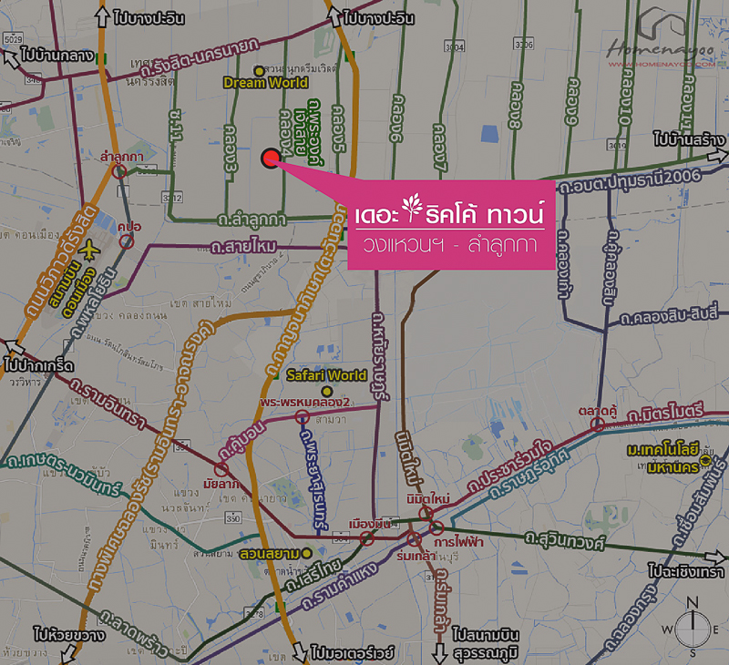 ทำเลที่ตั้งโครงการ – เดอะริคโค้ ทาวน์ วงแหวนฯ-ลำลูกกา ตั้งอยู่ติดถนนพระองค์เจ้าสายเป็นถนนหลักไม่ต้องเข้าซอย อยู่ห่างจากถนนลำลูกกาเพียง 2.5 กม. ทำเลรอบๆโครงการส่วนใหญ่จะเป็นบ้านพักอาศัย และพื้นที่ว่างเปล่า บรรยากาศค่อนข้างเงียบสงบเหมาะแก่การพักอาศัย ความอุดมสมบูรณ์รอบๆโครงการ ด้านหน้าโครงการใกล้ๆมีร้านค้าร้านอาหาร ร้านสะดวกซื้อ มีปั๊ม PTT ภายในมีทั้ง 7-11, KFC, Pizza Hut, Cafe Amazon มีตลาดใกล้ทั้งตลาด เอ.ซี. ตลาดกลางลาดสวาย ตลาดมหาลาภ ตามทางจะมีร้านค้า ร้านอาหารต่างๆ ร้านสะดวกซื้อ ร้านขายยา ตลอดสองฝั่งทาง หรือจะออกมาตรงเส้นลำลูกกาตามสองฝั่งทางก็มีร้านค้าร้านอาหารเป็นระยะเช่นกัน