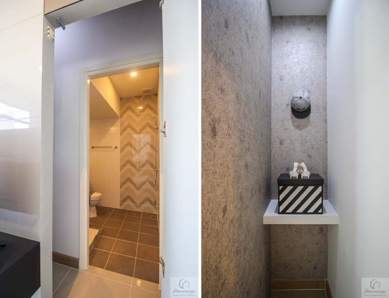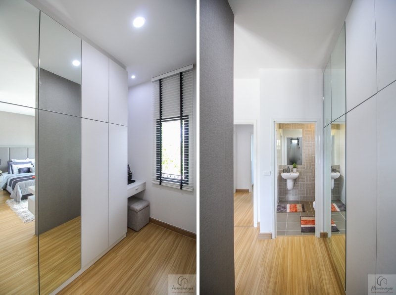 บ้านตัวอย่างกั้นผนังทำเป็น walk in closet มาให้ดู ด้านในวางตู้เสื้อผ้าและโต๊ะเครื่องแป้ง มีประตูเข้าห้องน้ำจากในห้องนอนได้เลย