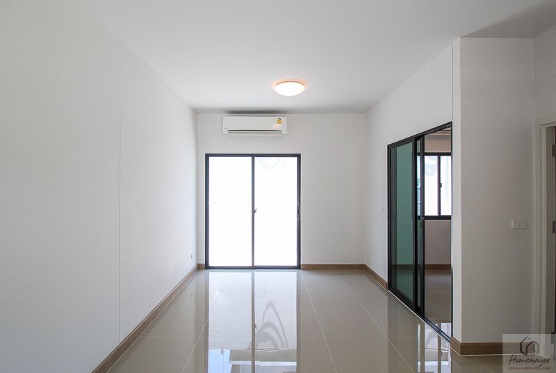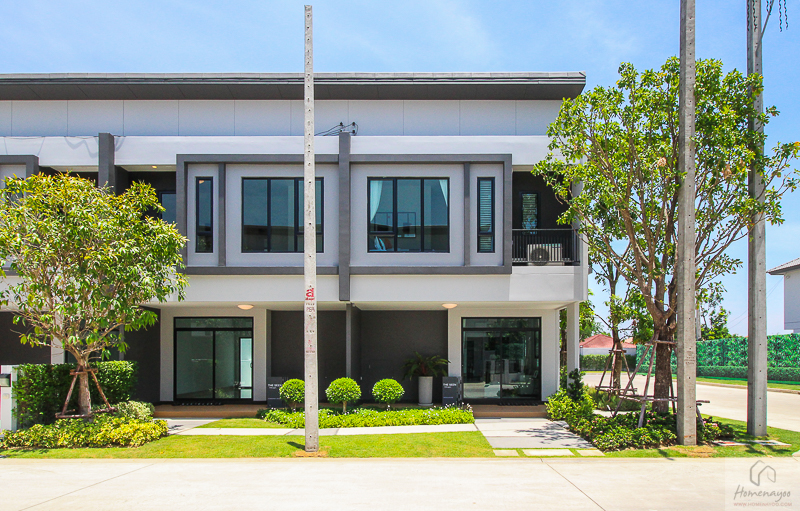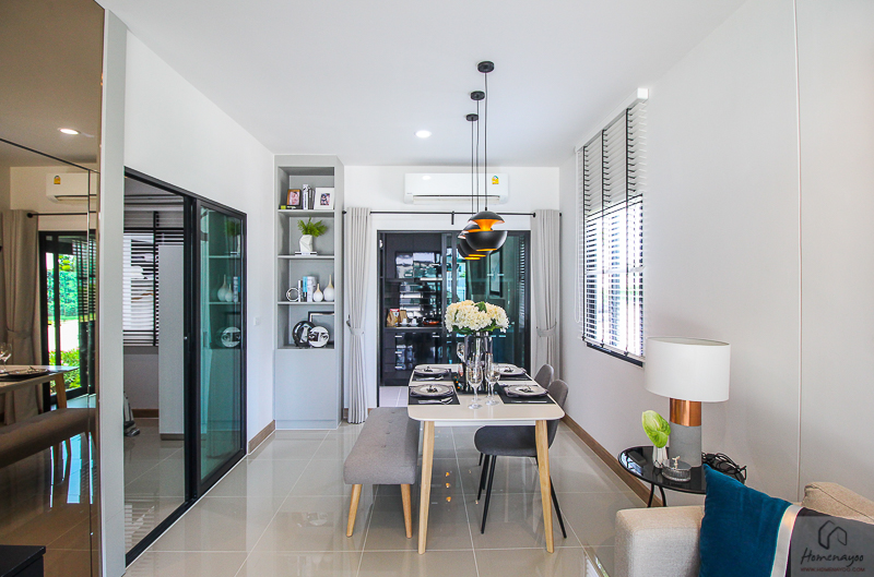 แบบบ้าน – ที่นี่มีให้เลือก 2 แบบคือบ้านทาวน์โอม และบ้านแฝด โครงการออกแบบมาในสไตล์ Modern Contemporary เป็นการออกแบบร่วมสมัยผสมผสานกับสไตล์โมเดิร์นได้อย่างลงตัว เน้นการออกแบบบ้านให้มีความอบอุ่น ดูทันสมัย โทนสีภายนอกสีเทาเข้ม และเทาอ่อน พื้นที่ในบ้านทำมาได้น่าอยู่ เน้นช่องแสงขนาดใหญ่ ช่วยให้แสงเข้าถึงแต่ละส่วนภายในบ้าน แต่ละส่วนของบ้านแบ่งพื้นที่มาให้ไม่อึดอัด ห้องดูโปร่งโล่ง ฝ้าสูง 2.75 – 2.9 ม. พื้นที่ในบ้านสามารถปรับเปลี่ยนได้ตามความต้องการของผู้อาศัย ด้านหลังบ้านมีพื้นที่ให้ต่อเติมได้อีก จะทำครัวในบ้านหรือต่อเติมหลังบ้านก็ได้