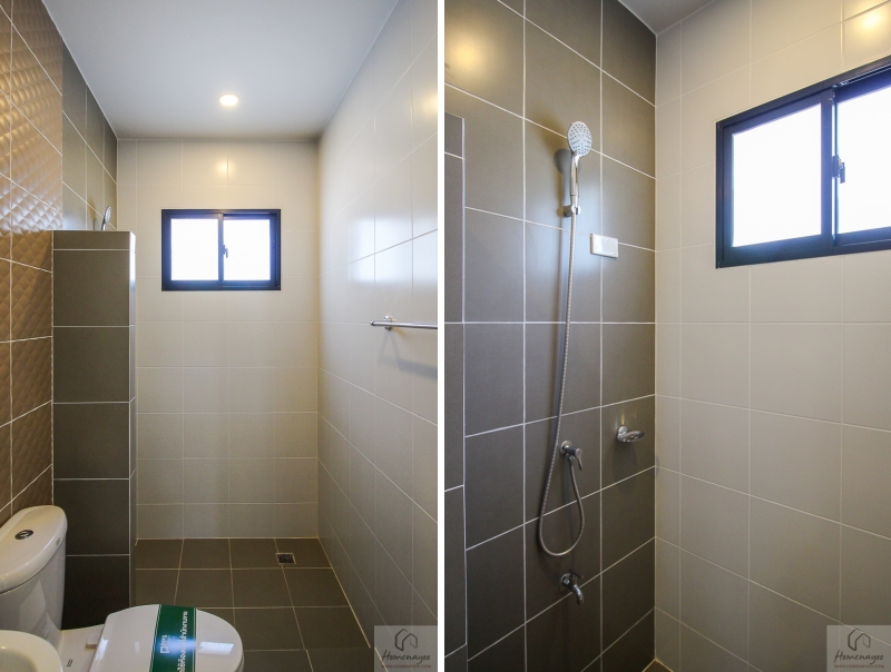 ด้านในเป็นพื้นที่ส่วนเปียก ติดตั้งฝักบัวมาให้เรียบร้อย มีช่องแสงบานเลื่อนเปิดระบายอากาศได้