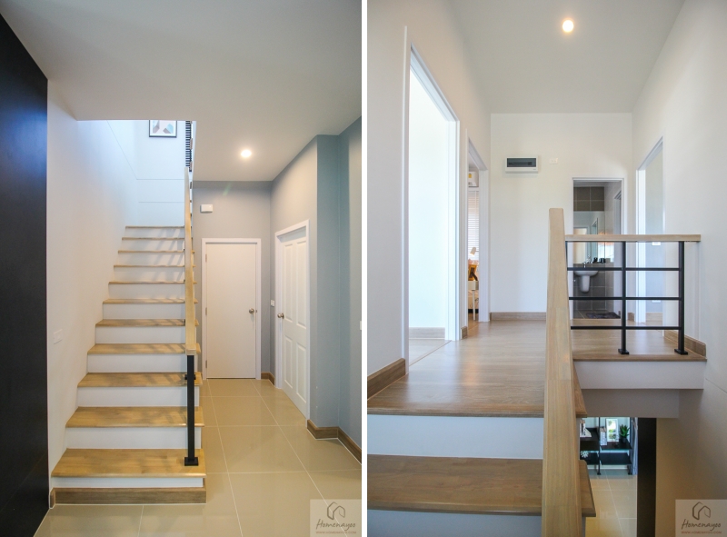 บันไดบ้านจะเป็นไม้สำเร็จรูป เดินขึ้นชั้นสองมาจะเจอโถงบันไดก่อน พื้นชั้นสองจะเป็นลามิเนตหนา 8 มม.