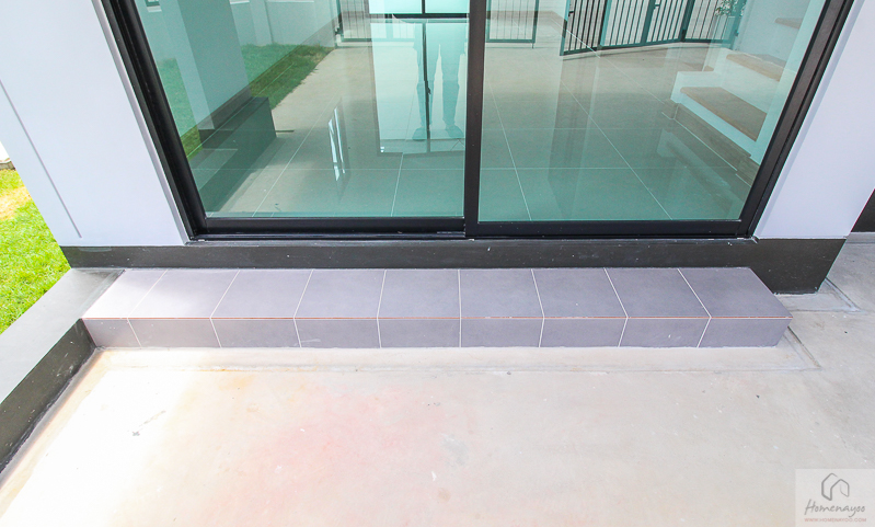 ประตูหน้าบ้านเป็นกระจกบานเลื่อน 2 บาน หน้าประตูมีเฉลียงขนาดประมาณ 3 x 0.60 ม.