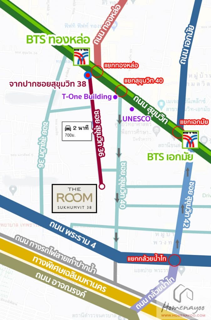 การเดินทางโดยรถส่วนตัว : The Room สุขุมวิท 38 จัดเป็นทำเลที่คนใช้รถมีความสะดวกสบาย และมีทางเลือกในการเข้าออกได้หลายเส้นทาง โดยตัวโครงการจะอยู่ห่างจากถนนใหญ่สุขุมวิท ประมาณ 700 เมตร ซึ่งเป็นสุขุมวิทย่าน CBD โซนใน