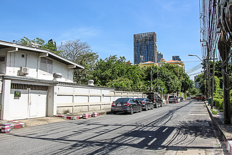 มองออกไปทางหน้าปากซอยสุขุมวิท 38 ตลอดสองข้างทางจะเป็นที่ดินเปล่ารอการพัฒนาของ Developer ต่าง ๆ สลับกับร้านอาหาร, คาเฟ่ และ บ้านเดี่ยวหลังใหญ่