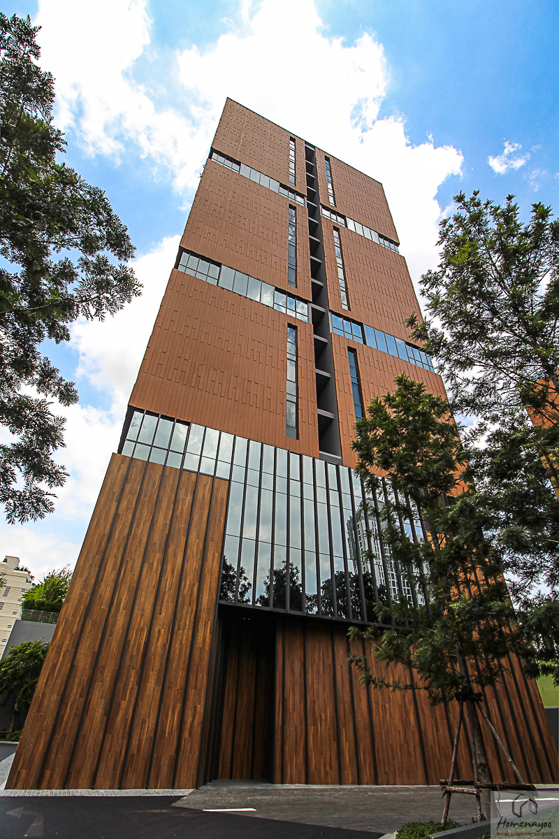 พื้นผิวอาคารภายนอกออก ตกแต่งด้วยพื้นผิววัสดุลายไม้ ชั้นล่างสุดเป็นไม้จริง ส่วนชั้นบนเป็น Precast Concrete ทาสีลายไม้ เพื่อความทนทานและง่ายต่อการดูแลรักษาค่ะ