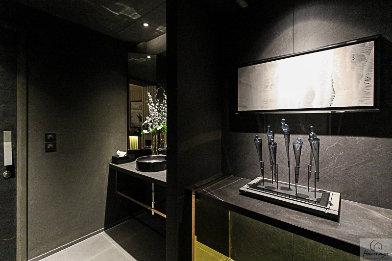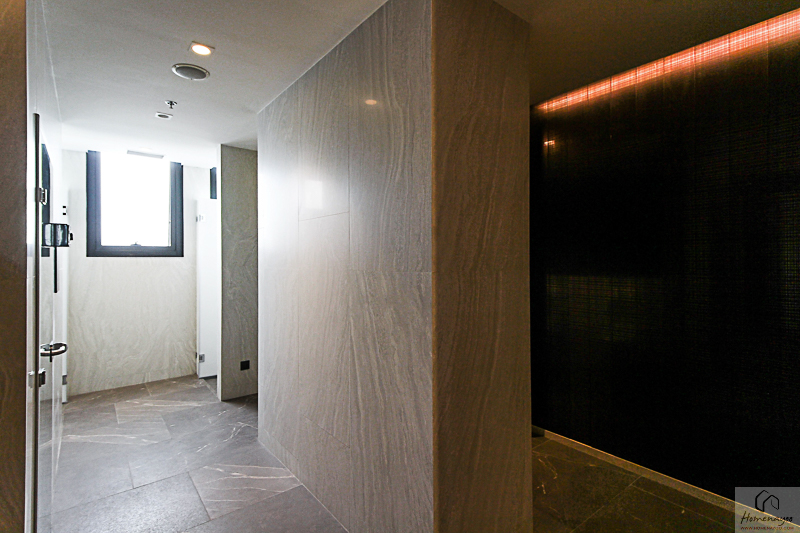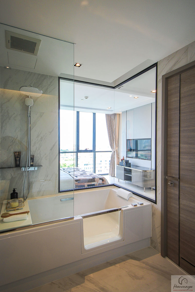 ซ้ายมือจะเป็นห้องน้ำแบบ Sexy Bath คือส่วนที่ติดกับอ่างอาบน้ำจะมีกระจกเข้ามุมแบบ Bay Window ที่ช่วยให้แสงธรรมชาติเข้ามาในห้องน้ำได้มากขึ้น และสามารถนอนแช่น้ำอุ่น พร้อมดูทีวีไปด้วยได้