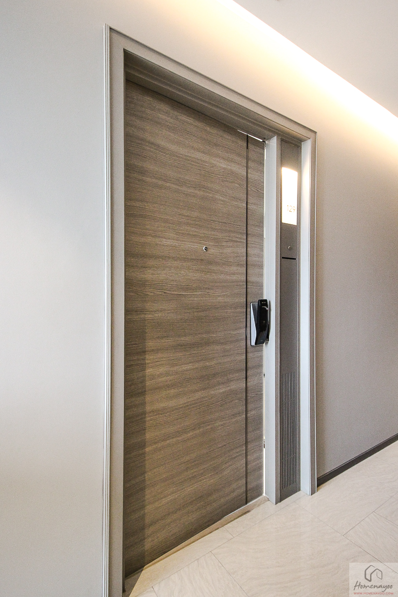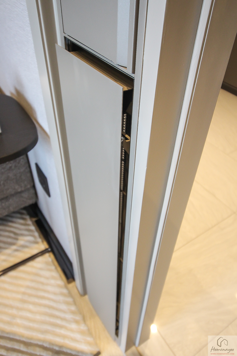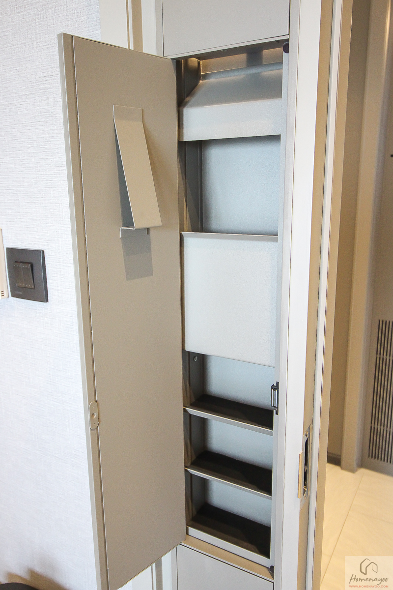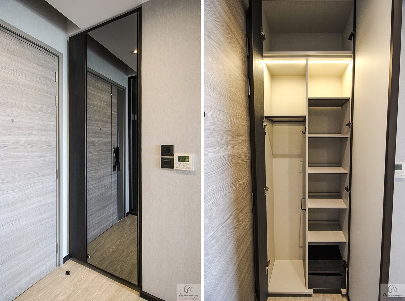 ด้านขวามือของประตูห้องจะมีตู้เก็บของบิวท์อิน หน้าบานกระจกเงาทำความสูงจรดเพดานมาให้ ก่อนออกไปไหนมาไหนก็ส่องกระจกก่อนออกจากบ้านไปได้ เปิดตู้ให้ดูด้านในจะแบ่งครึ่ง ฝั่งนึงใช้วางรองเท้า ฝั่งนึงใช้แขวนร่มหรือวางอุปกรณ์กีฬา หรือถุงกอล์ฟได้