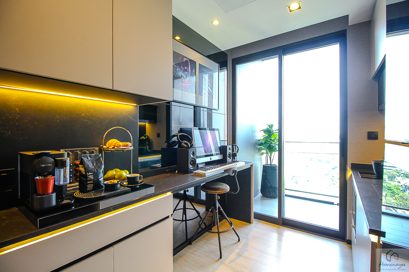 เข้าห้องมาจะเจอส่วน Public อย่างส่วนครัวปิด ห้องรับประทานอาหาร เชื่อมต่อกับห้องนั่งเล่นติดระเบียง ห้องนั่งเล่นกว้างขวางเหมาะกับการนั่งพักผ่อนดูหนังสบายๆ