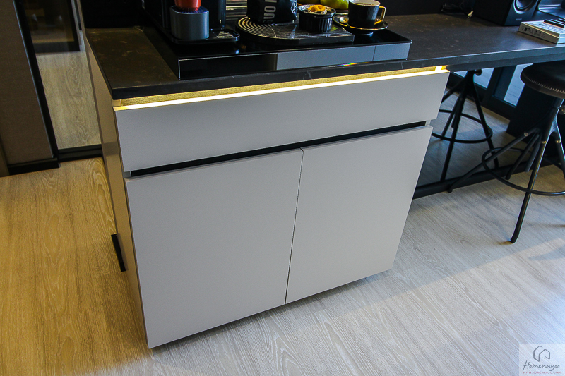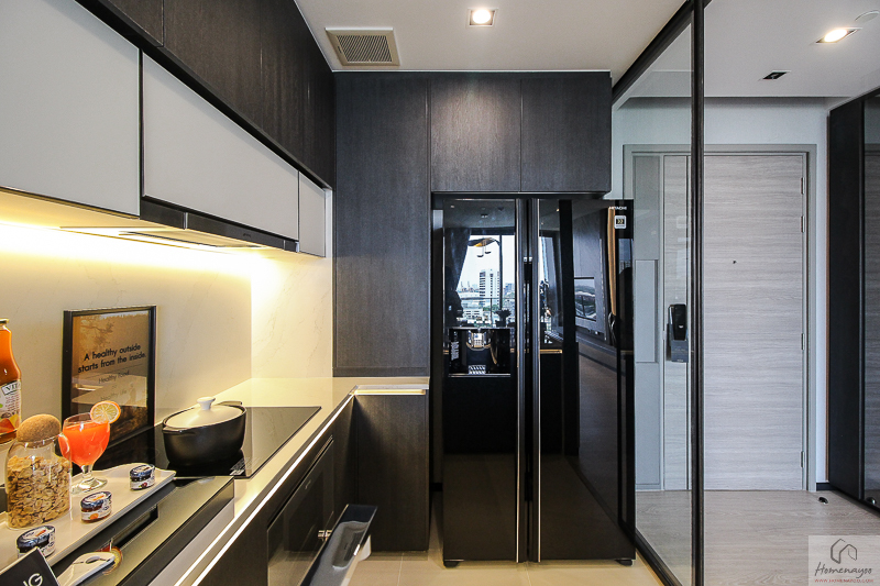 ส่วนแรกสุดทางขวามือวางตู้เย็นมาให้ดูระยะใช้งาน เปิดเคาน์เตอร์ครัวบนล่างให้ดูจะเห็นว่ามีชั้นมาให้เยอะดี สามารถเก็บของได้มาก