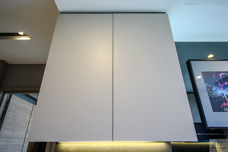 พื้นส่วนครัวเป็นกระเบื้อง Porcelain สีขาวผิว Matt ขนาด 60 x 6o ซม. และรางประตูเป็นแบบแขวนเพดานนะคะ ซึ่งก็ทำให้เช็ดล้างทำความสะอาดห้องได้ง่ายและเดินไม่สะดุด ติดตั้งชุดครัวมาให้เป็นรูปตัว U มีระยะเดินประมาณ 1 เมตร เป็นระยะกำลังดีไม่อึดอัด