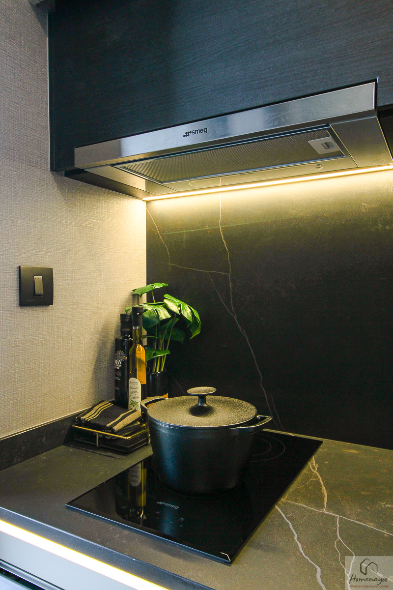 ส่วนเตาจะได้เป็นเตาไฟฟ้าแบบ 4 หัว พร้อมเครื่องดูดควันของ Smeg ด้านข้างเตาไฟฟ้ามีพื้นที่ว่างมาให้ เวลาประกอบอาหารสะดวกดีค่ะ เพราะมีที่พักหม้อพักกระทะ หรือวางวัตถุดิบด้านข้างมาให้แบบนี้